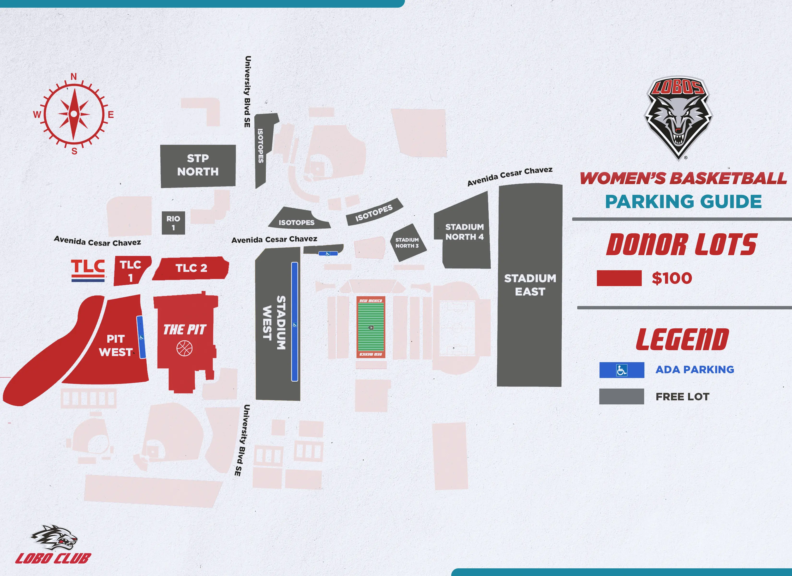 Season ticket holders who are also Lobo Club members will receive a parking pass in a pre-assigned lot with a season ticket contribution of $100 or more to the Lobo Scholarship Fund.