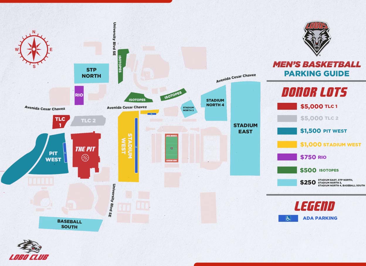 Season ticket holders who are also Lobo Club members will receive a parking pass in a pre-assigned lot with a season ticket contribution of $250 or more to the Lobo Scholarship Fund.